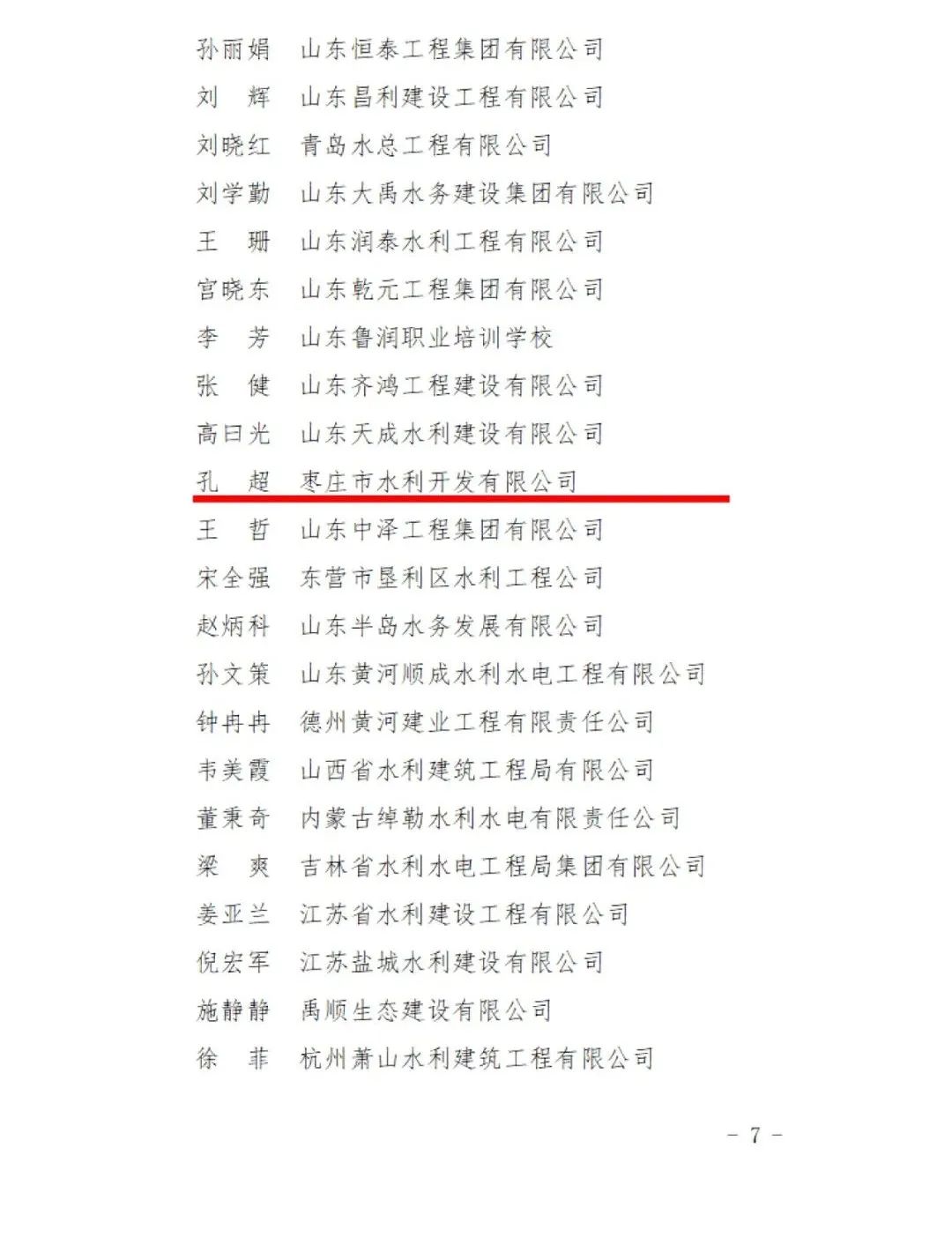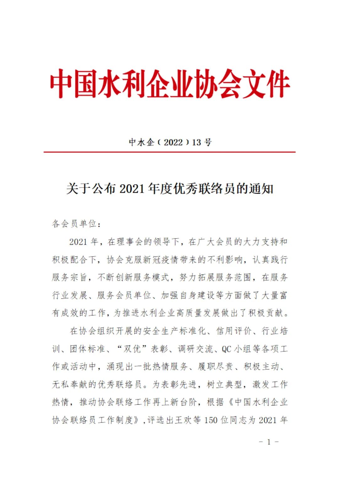 近日,中國水利企業(yè)協(xié)會公布了2021年度全國優(yōu)秀聯(lián)絡(luò)員名單,棗莊市水利開發(fā)有限公司的孔超同志榮獲全國優(yōu)秀聯(lián)絡(luò)員稱號。
